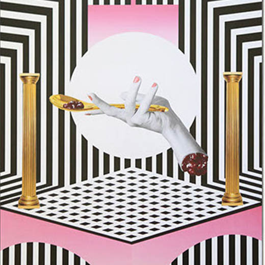 hands floating amongst a black and white geometric backdrop.
